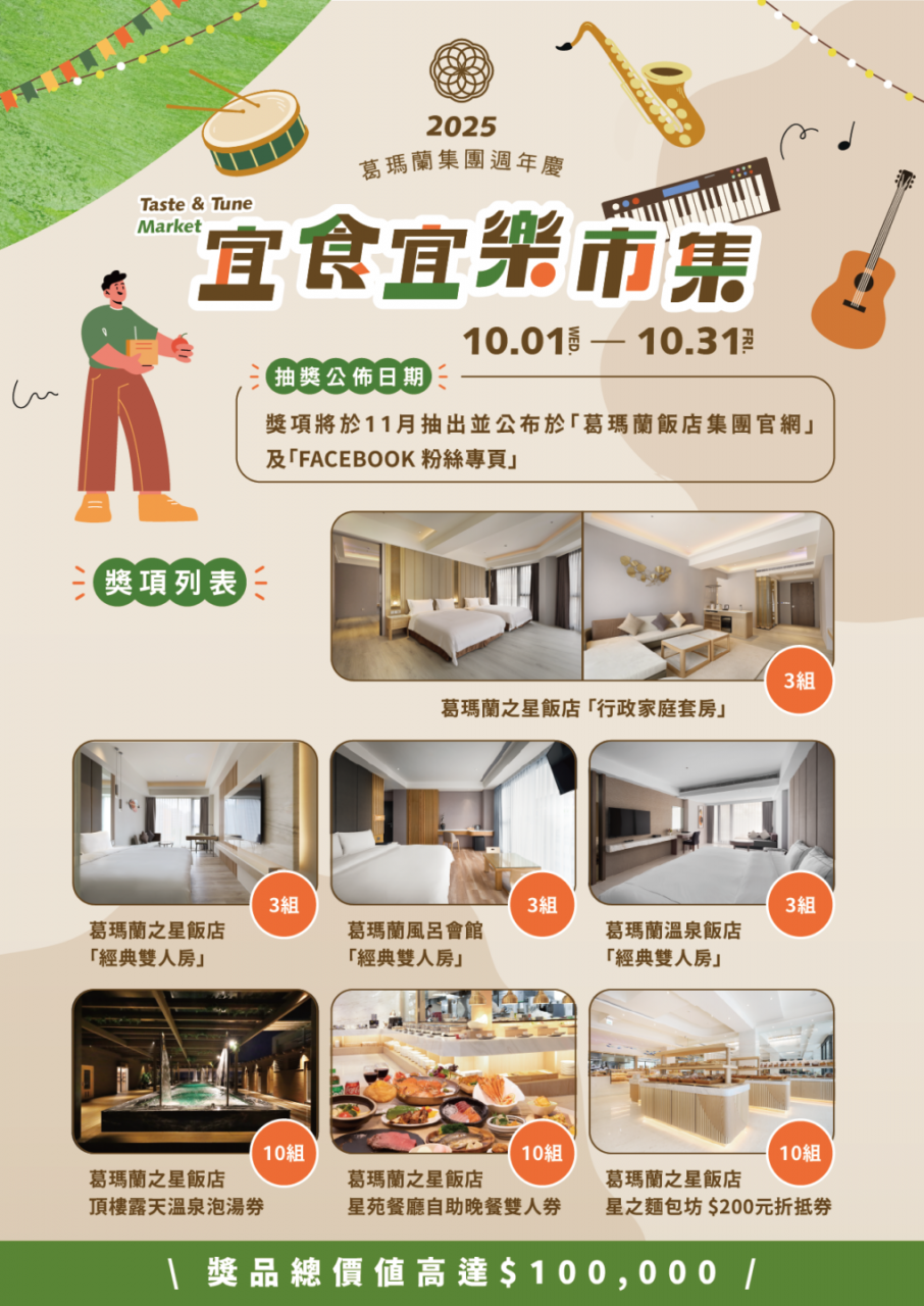 .2025/10/01-10/31期間,凡入住葛瑪蘭飯店集團之住客,皆贈送乙張「市集集點抽獎卡」。